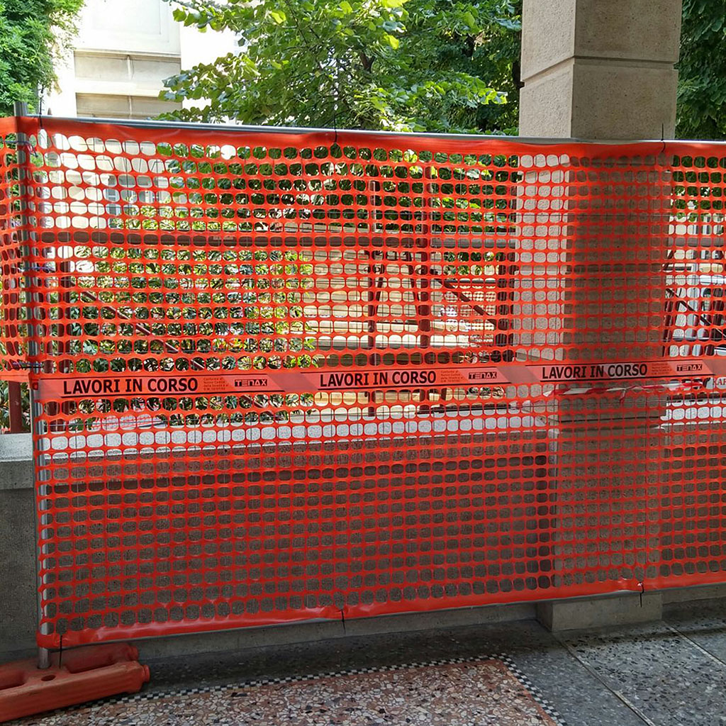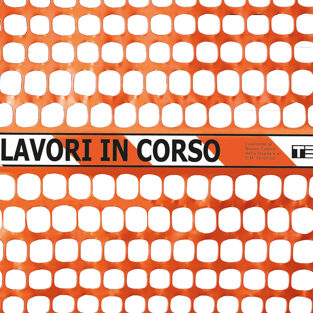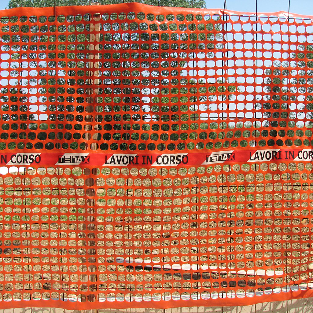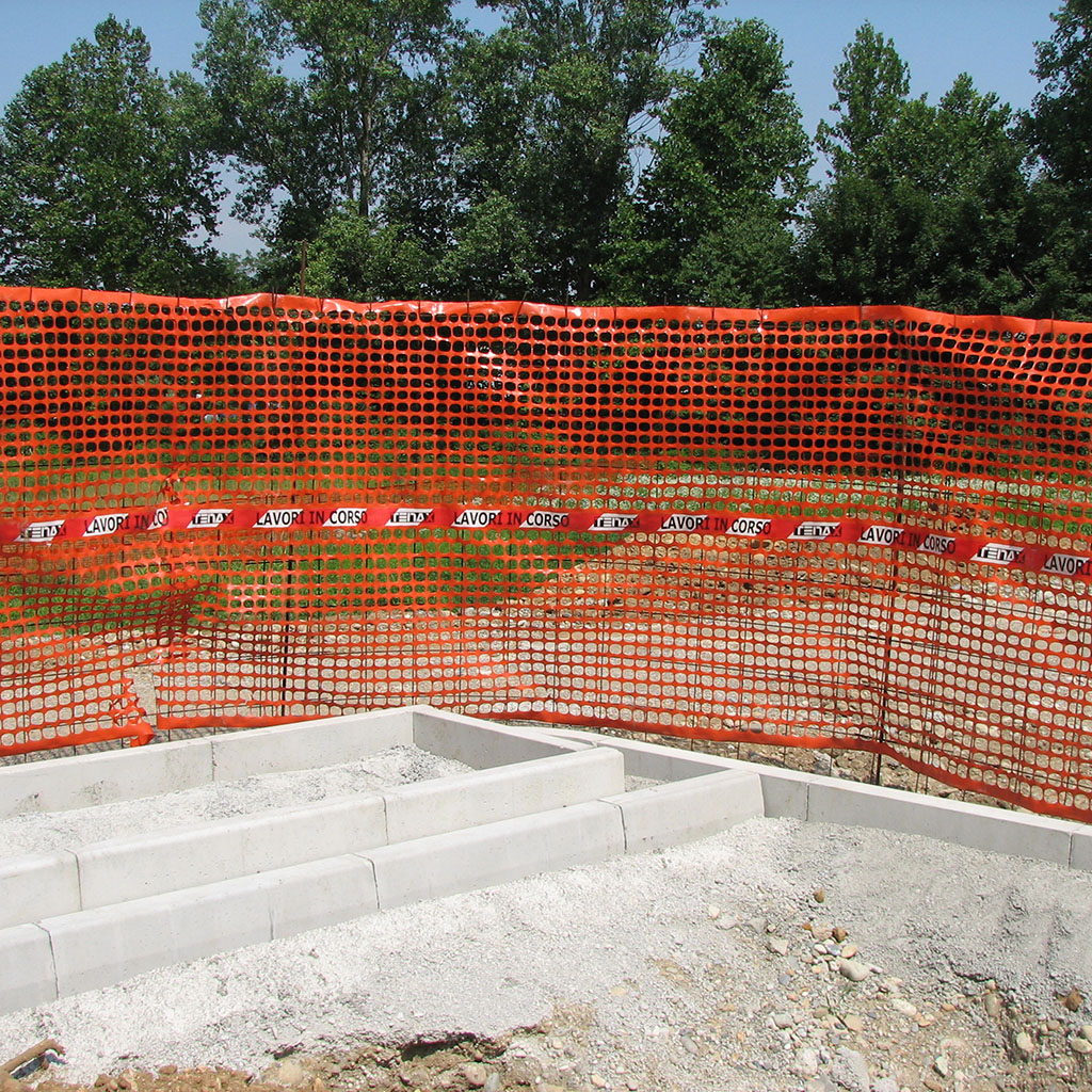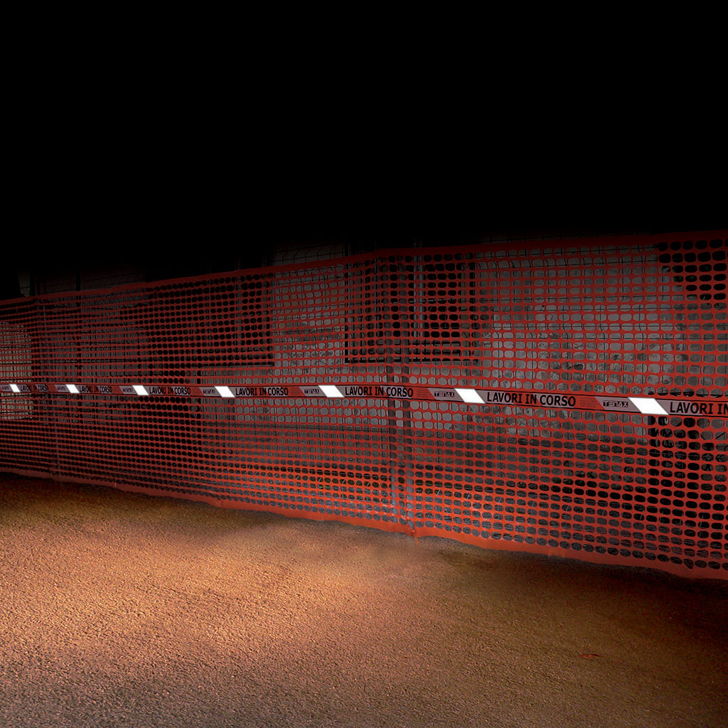 Rete da cantiere estrusa in polietilene (HDPE) a maglia quadrangolare con bordo e fascia centrale antistrappo. Dotata di banda rifrangente e nastro bianco e rosso con scritta “Lavori in corso” termo-accoppiato in corrispondenza della fascia centrale.