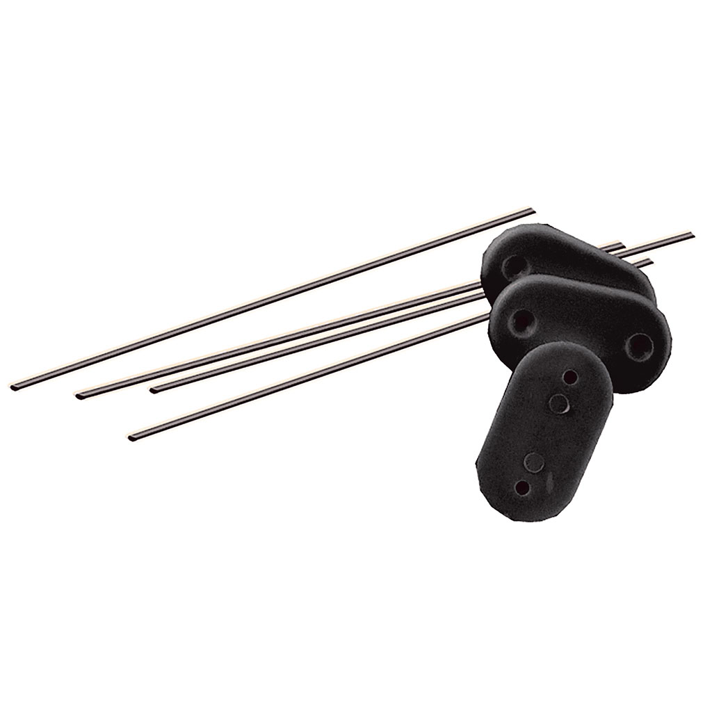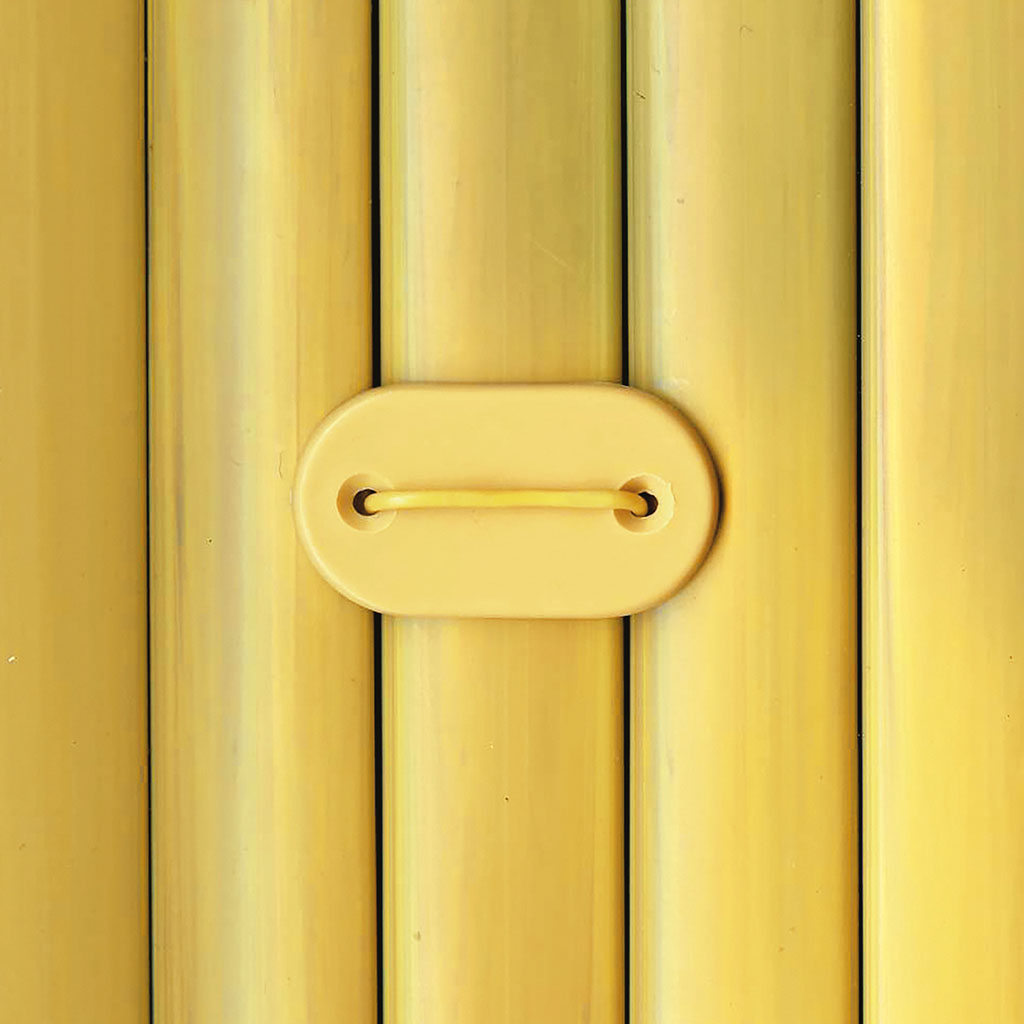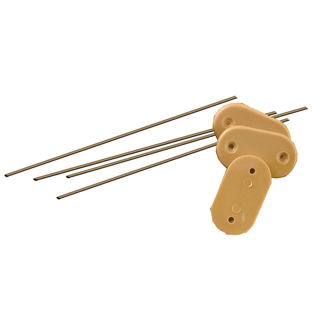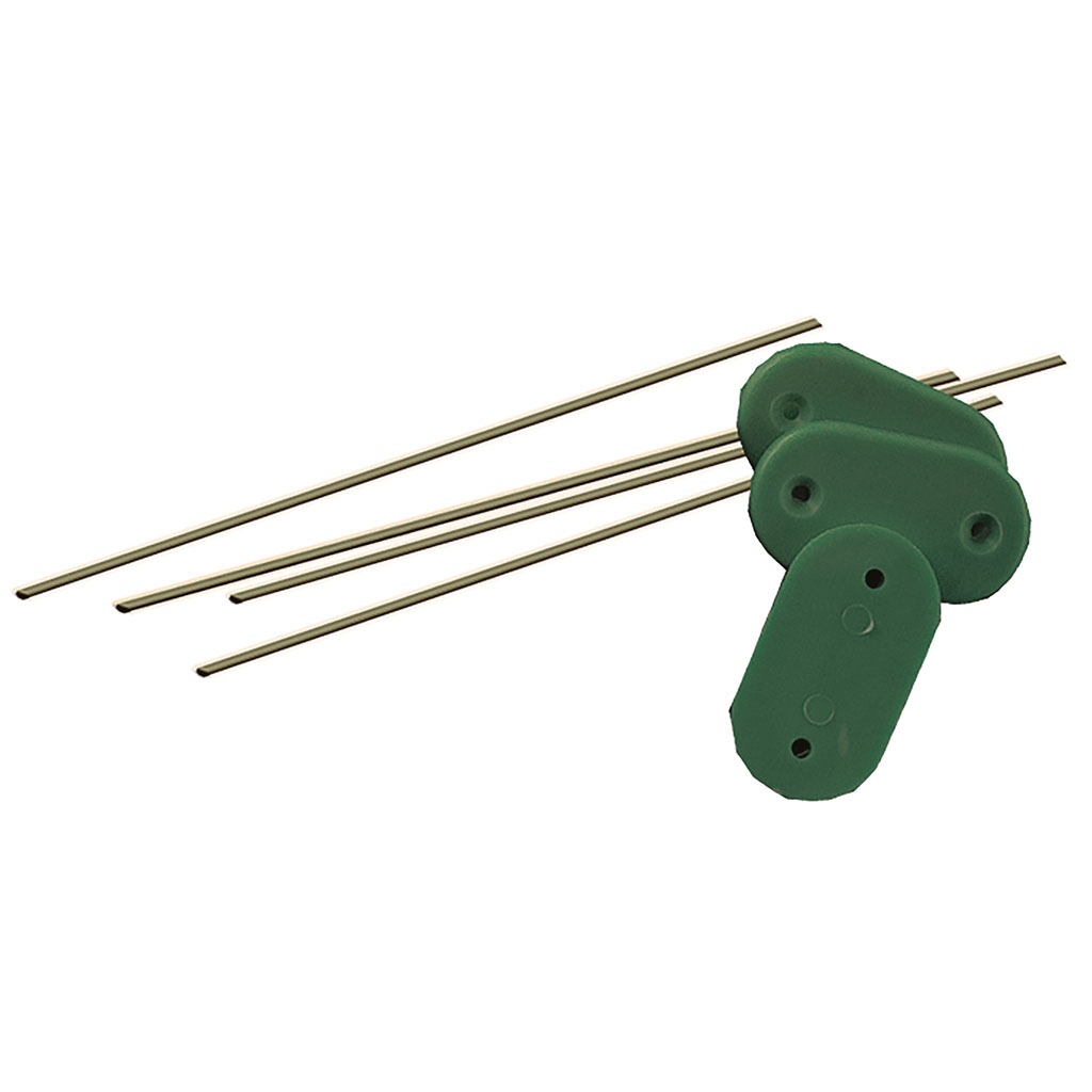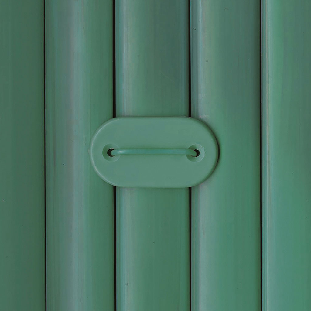 Composte da una placchetta piatta in plastica con due fori, attraverso i quali passa un filo di ferro plastificato lungo 15 cm, consentono di legare due o più canne tra loro e fissarle alla recinzione esistente. La placchetta protegge le canne da danni, garantendo un fissaggio saldo ed efficace.