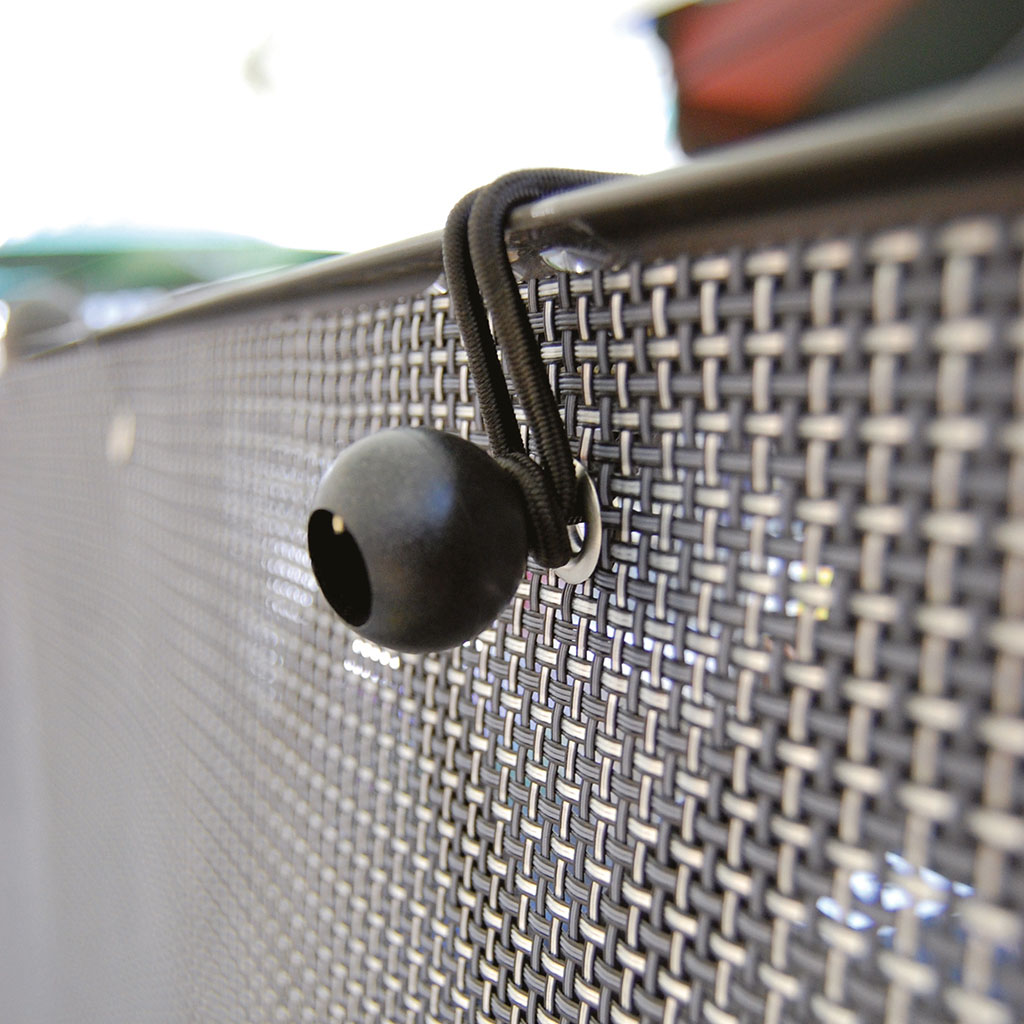 Il laccetto va inserito nell’occhiello della schermatura o del telo, l’elastico viene avvolto e fissato facendo passare il laccio intorno alla pallina di fermo.