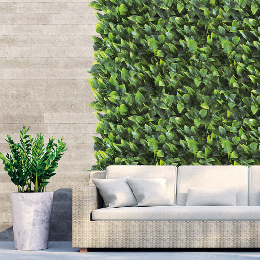 Siepe artificiale tipo Pothos a pannelli componibili realizzata in polietilene. Perfetta come decorazione per la casa, posizionata su pareti come giardino verticale. Il retro del pannello è una griglia in plastica di colore verde, modulare e facilmente agganciabile ad altri pannelli per ottenere la misura desiderata.